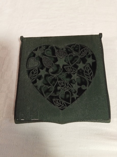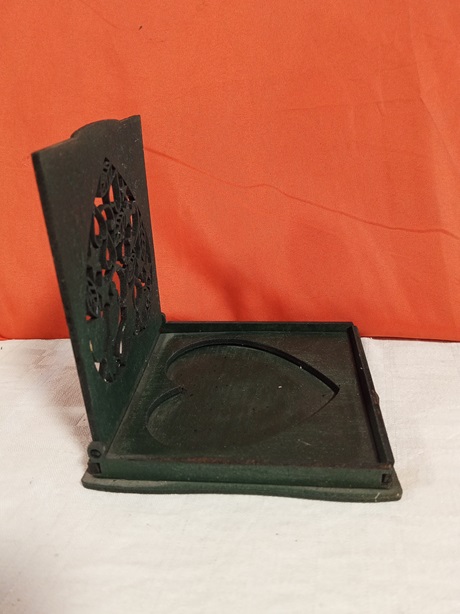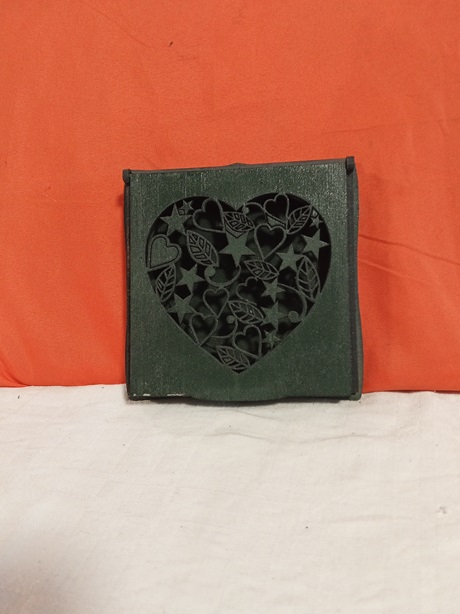 La tapa de la caja, con su profundo color (como el verde bosque o verde oscuro), presenta un patrón intrincado cortado a láser que permite vislumbrar un fondo, creando un efecto visual fascinante. En su interior, encontraréis un suave hueco en forma de corazón diseñado para sostener vuestros anillos de forma segura y elegante.
