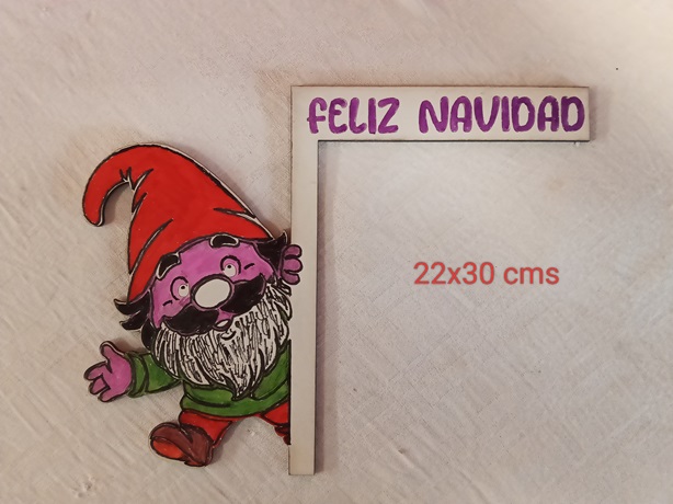 El duende está pintado a mano con colores vibrantes que capturan el espíritu festivo, como se aprecia en la imagen de referencia. Está fabricado en madera MDF de alta calidad con un grosor de 3 mm, asegurando durabilidad y ligereza. El corte se realiza con tecnología láser de precisión, lo que garantiza contornos limpios y un acabado impecable.