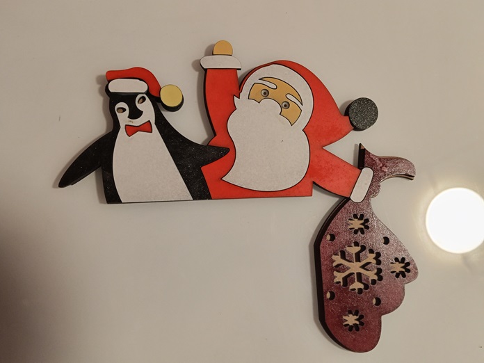 Personajes Encantadores: El diseño incluye a Papá Noel (Santa Claus) con su barba blanca y traje rojo, un adorable Pingüino con gorro navideño y, separadamente, el Saco de Regalos con un detallado copo de nieve tallado.