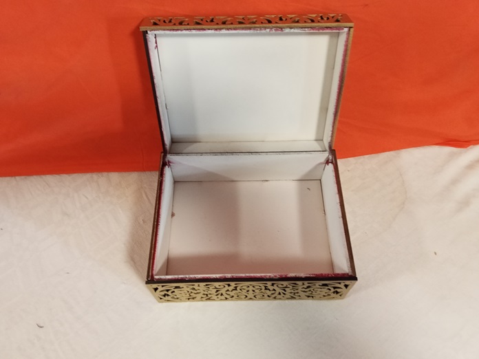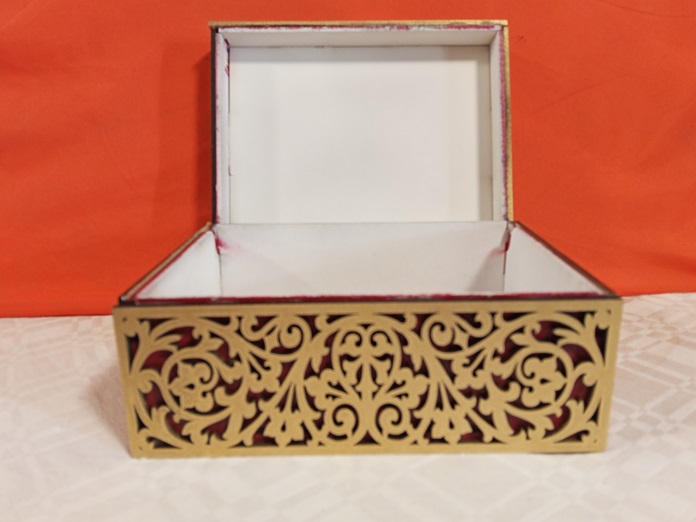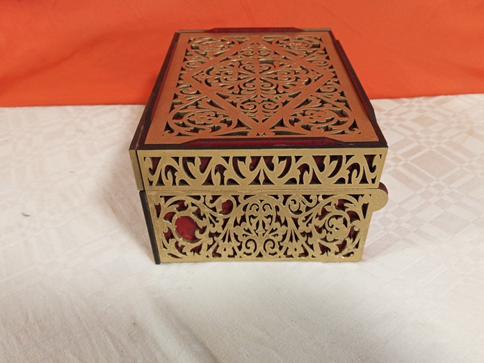 Lujoso joyero 💎 de diseño barroco con detallado calado floral cortado a láser en MDF 3mm. Presenta un sofisticado efecto de doble capa (dorado sobre fondo rojo 🌹). Ideal para guardar joyas. Elegancia vintage asegurada. Medidas: 18x14x10 cms.