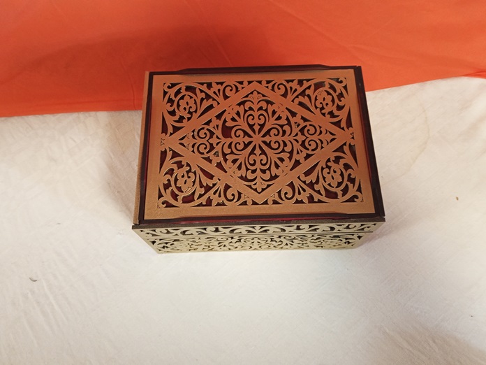 Lo que hace especial a este joyero es su construcción de doble capa: la capa exterior es un delicado calado de madera MDF de 3 mm cortado con tecnología láser de máxima precisión, creando un efecto de encaje. Esta capa dorada se superpone a una capa interior, visible en un tono rojo intenso 🌹 (o forro interior), que crea un contraste visual dramático y realza la belleza del patrón calado.