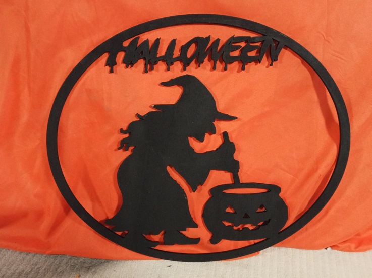 Fabricado en Madera MDF de alta calidad, el mural presenta la silueta nítida de una bruja cocinando una pócima en un caldero de calabaza sonriente. El diseño está enmarcado en un óvalo elegante y coronado con la palabra «HALLOWEEN» con un efecto de goteo o sangre, añadiendo un toque extra de terror.