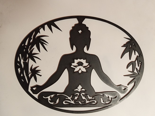 Tecnología de Vanguardia: El perfilado se realiza mediante corte láser de alta precisión, garantizando bordes limpios y una definición impecable en los detalles más finos, como las hojas y los dedos de Buda.