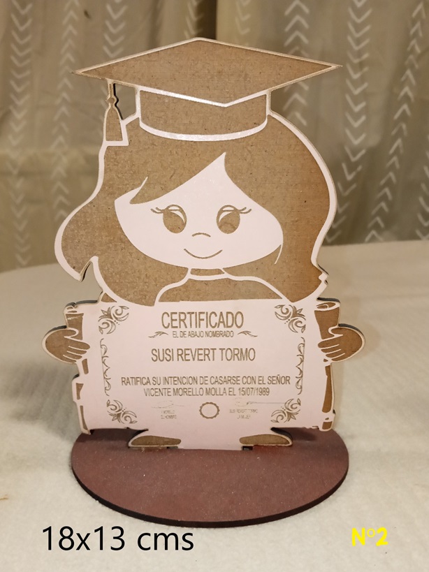 - Diseño: Figura de graduado con birrete, sosteniendo un pergamino (certificado) con espacio para texto personalizado. Base ovalada para soporte.
