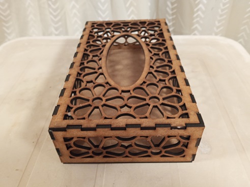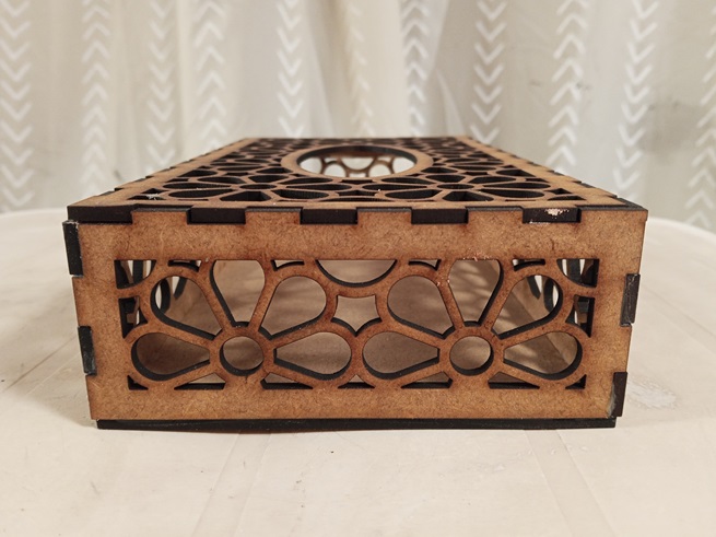 Portapañuelos de madera MDF con diseño floral en corte láser. Elegante y resistente, ideal para decorar sala, recámara, baño u oficina. Medidas: 23x13x5 cm. Dale un toque artesanal y moderno a tus espacios con este práctico organizador de pañuelos. Personalizable y perfecto como regalo original.