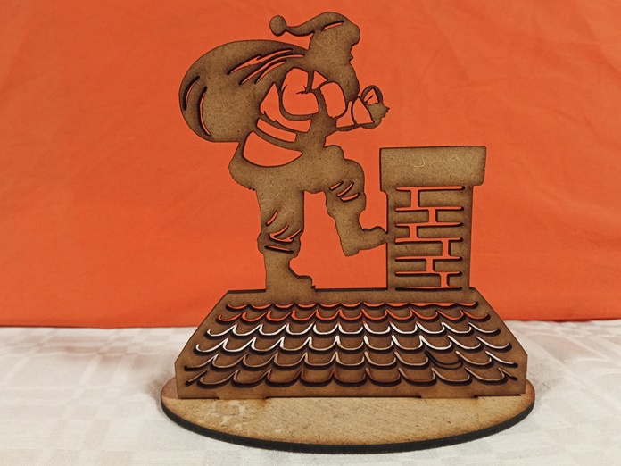 Este diseño exclusivo ha sido creado con madera MDF de alta calidad y la precisión milimétrica del corte láser. La silueta dinámica de Papá Noel, con su saco de regalos al hombro, descendiendo por la chimenea sobre un tejado nevado, es una imagen icónica que llenará de alegría tu decoración. La base del tejado cuenta con un calado estratégico donde se coloca la vela de té, permitiendo que la luz se filtre, simulando el resplandor de una chimenea interior y creando un efecto de luz festivo y envolvente.