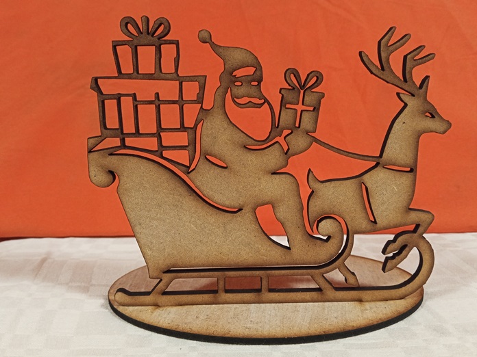 Diseñado meticulosamente con madera MDF de alta calidad y cortado con la precisión insuperable del corte láser, este portavelas presenta una escena clásica: Papá Noel sonriente en su trineo, con una pila de regalos listos para ser entregados, mientras es tirado por un majestuoso reno. El trineo está ingeniosamente diseñado para albergar una vela de té, que al encenderse, permite que la luz se filtre a través de la silueta. Este efecto de luz cálido y mágico realza los contornos de la escena, proyectando sombras festivas que llenan de ambiente cualquier habitación.